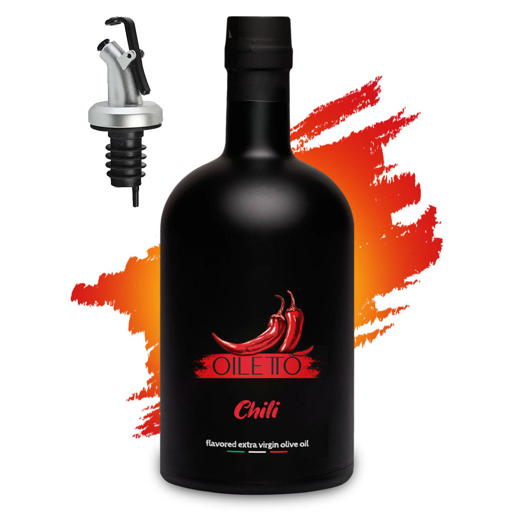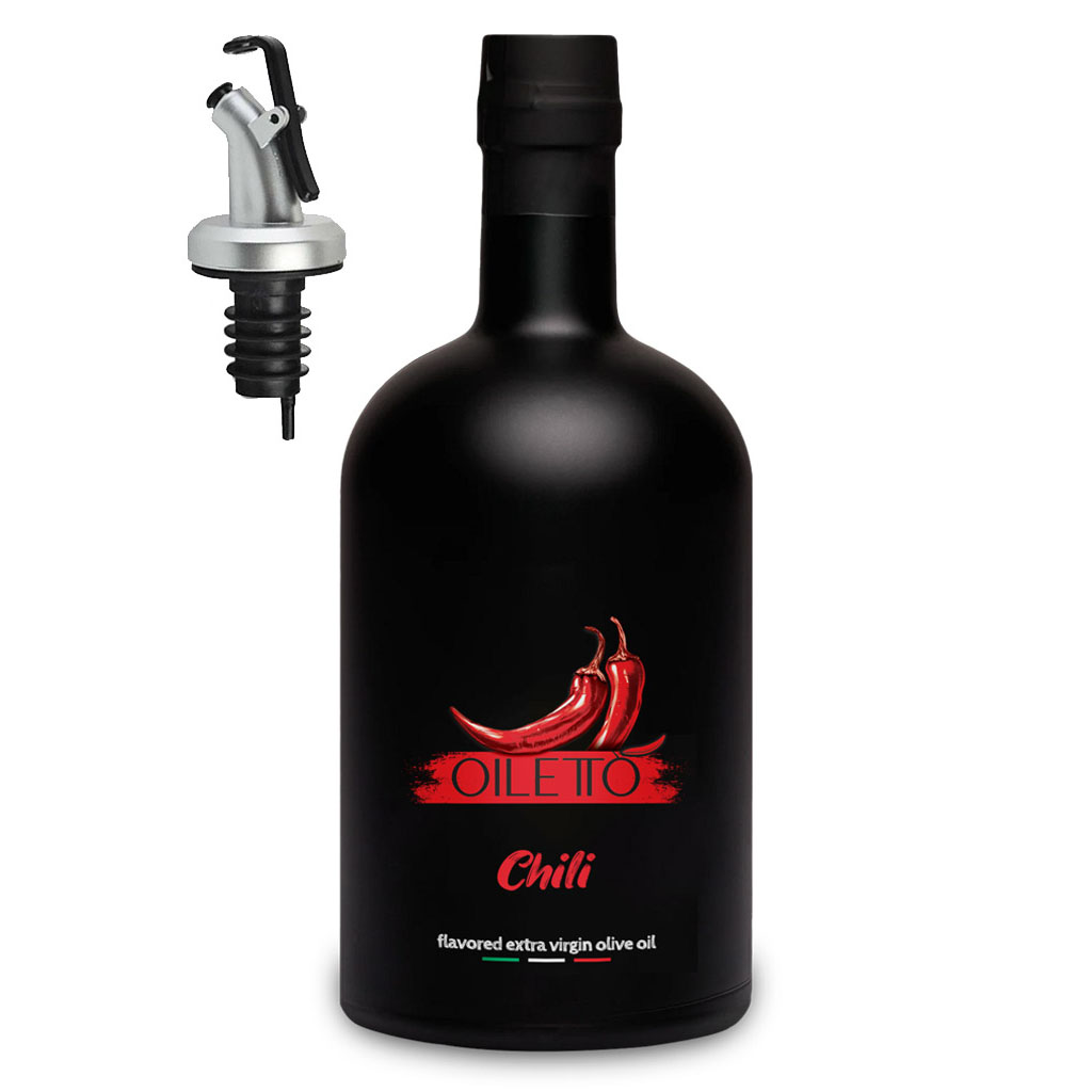 برای بستهبندی روغن زیتون با طعم فلفل قرمز (چیلی) اویلتو از بطری شیشهای با روکش به رنگ مشکی مات استفاده شده که علاوه بر بخشیدن نمای بصری مدرن، متفاوت و لوکس همراستا با درجه کیفی روغن استفاده شده، با جلوگیری از نفوذ نور به داخل بطری موجب حفظ کیفیت و ماندگاری بالاتر میگردد.